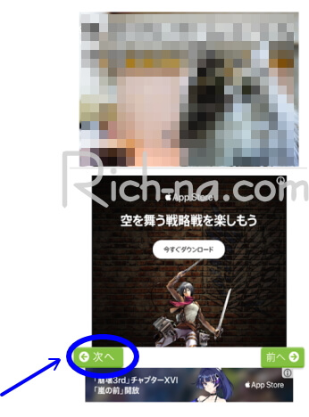 タップし損ねると広告が開くので、できるだけ的確に「次へ」を狙ってくださいね。